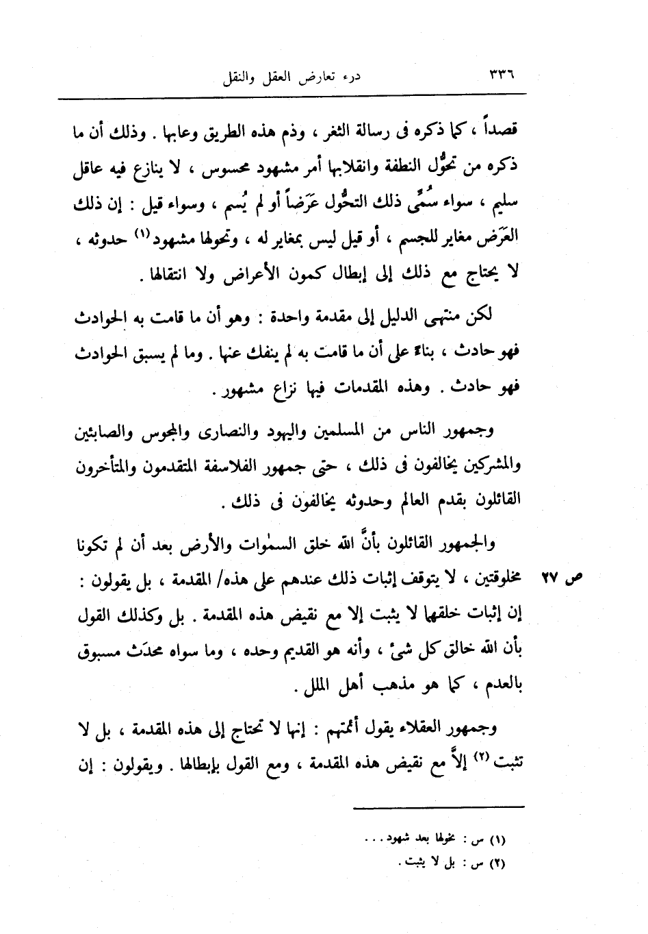وجمهور الناس من المسلمين واليهود النصاري والمجوس والصابئين والمشركين يخالفون في ذلك، حتى جمهور الفلاسفة المتقدمون والمتأخرون القائلون بقدم العالم وحدوثه يخالفون في ذلك.
