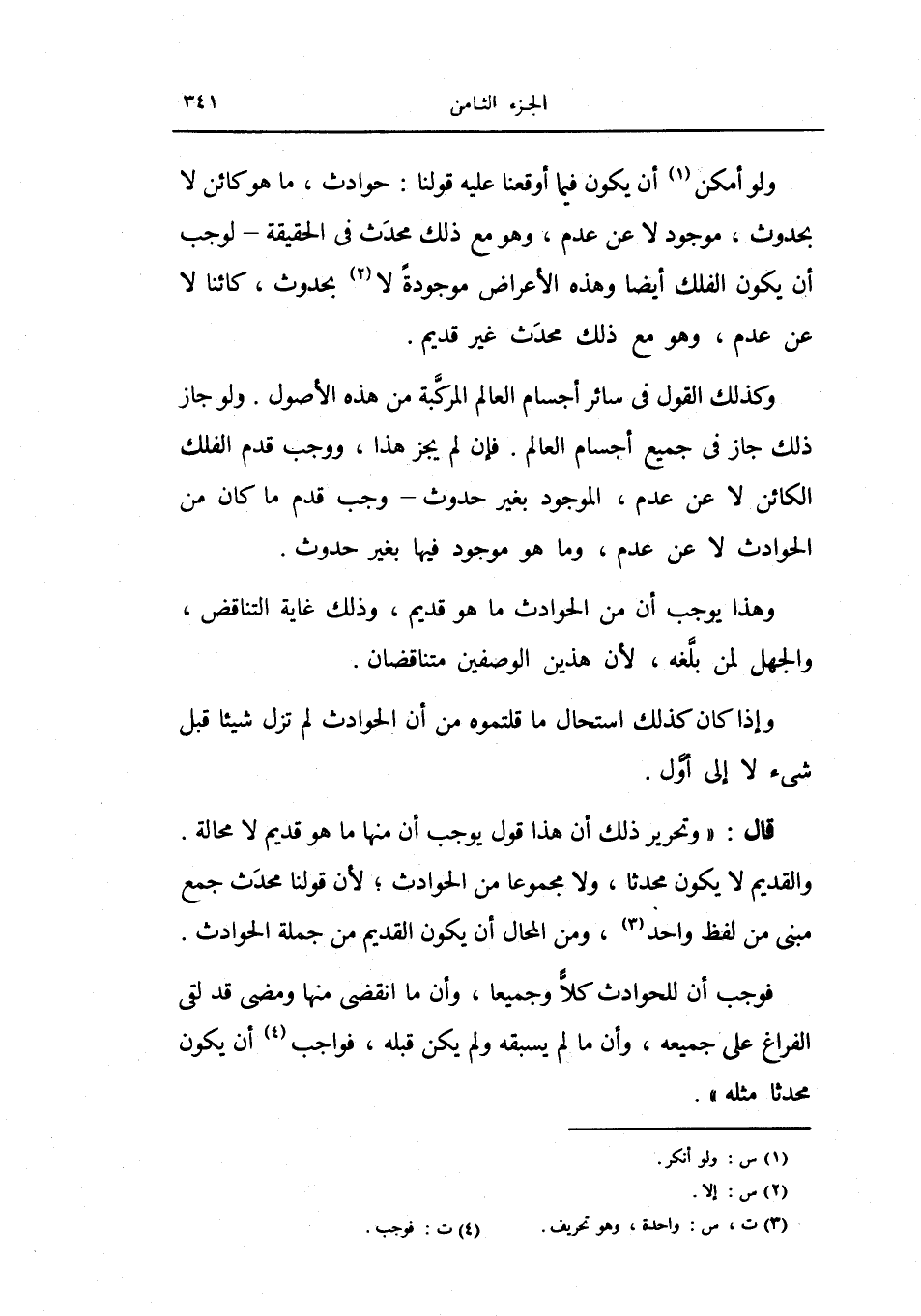 ولو أمكن أن يكون فيما أوقعنا عليه قولنا: حوادث، ما هو كائن لا بحدوث، موجود لا عن عدم، وهو مع ذلك محدث في الحقيقة - لوجب أن يكون الفلك أيضاً وهذه الأعراض موجودةً لا بحدوث، كائناً لا عن عدم، وهو مع ذلك محدث غير قديم.