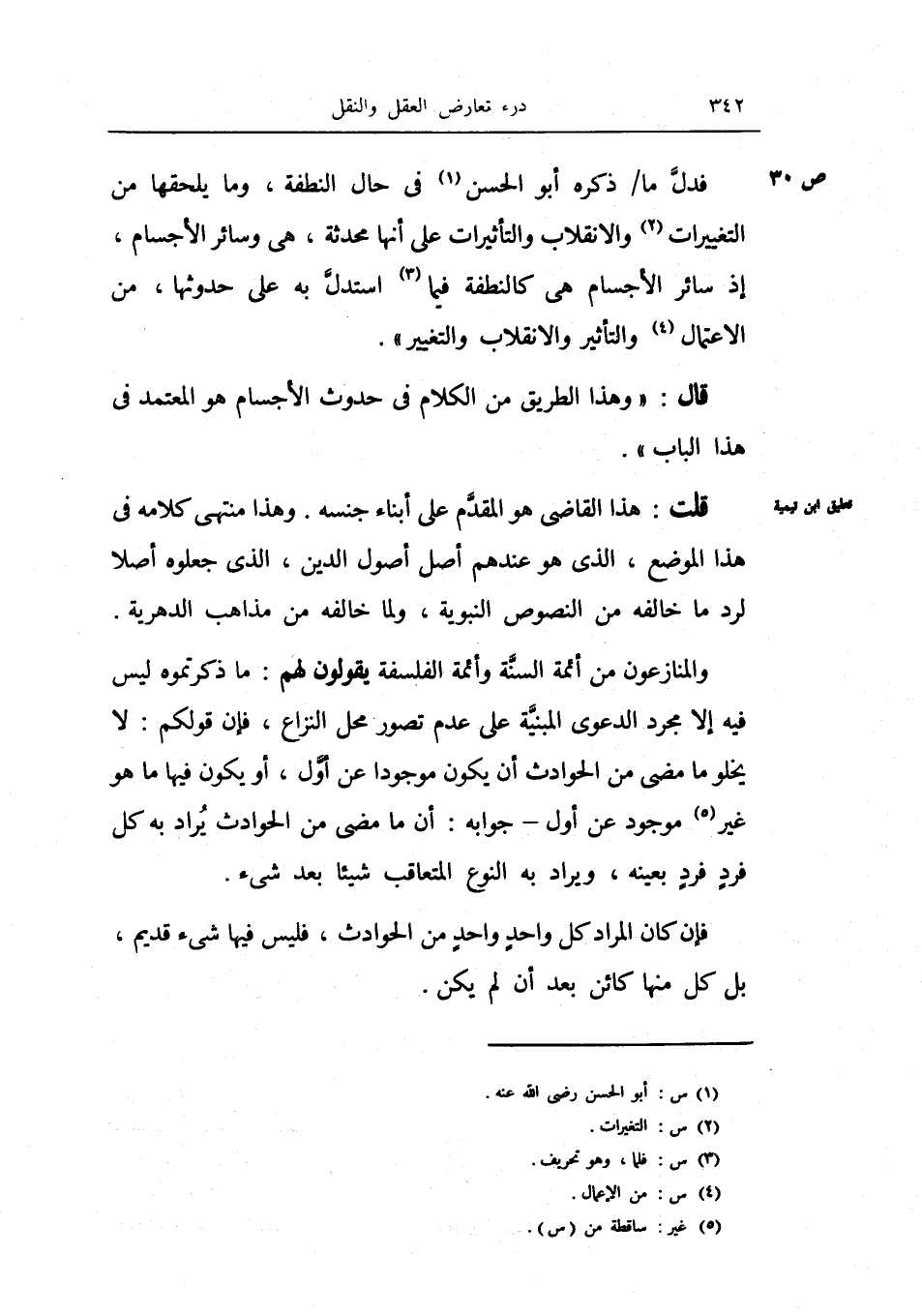 والمنازعون من أئمة السنة وأئمة الفلسفة يقولون لهم: ما ذكرتموه ليس فيه إلا مجرد الدعوى المبنية على عدم تصور النزاع، فإن قولكم: لا يخلو ما مضى من الحوادث أن يكون موجوداً عن أول، أو يكون فيها ما هو غير موجود عن أول - جوابه: أن ما مضى من الحوادث يراد به كل فرد بعينه، ويراد به النوع المتعاقب شيئاً بعد شيء.