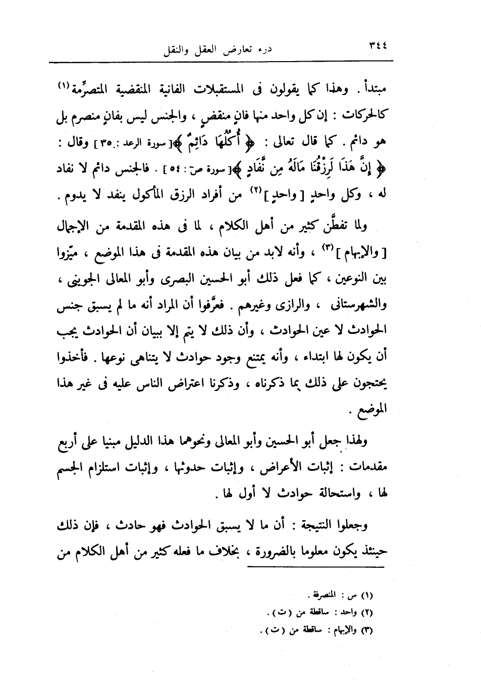 فعرفوا أن المراد أنه ما لم يسبق جنس الحوادث لا عين الحوادث، وأن ذلك لا يتم إلا ببيان أن الحوادث يجب أن يكون لها ابتداء، وأنه يمتنع وجود حوادث لا يتناهى نوعها.