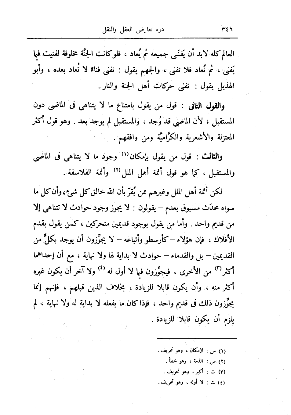 والثالث: قول من يقول بإمكان وجود ما لا يتناهى في الماضي والمستقبل كما هو قول أئمة أهل الملل وأئمة الفلاسفة.