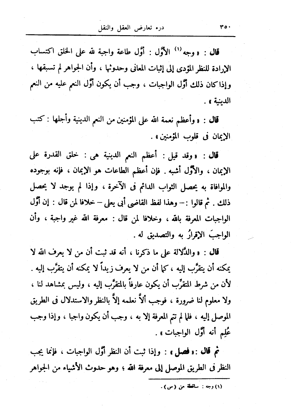 قال: (وجه الأول: أول طاعة واجبة لله على الخلق اكتساب الإرادة للنظر المؤدي إلى إثبات المعاني وحدوثها، وأن الجواهر لم تسبقها، وإذا كان ذلك أول الواجبات، وجب أن يكون أول النعم عليه من النعم الدينية) .