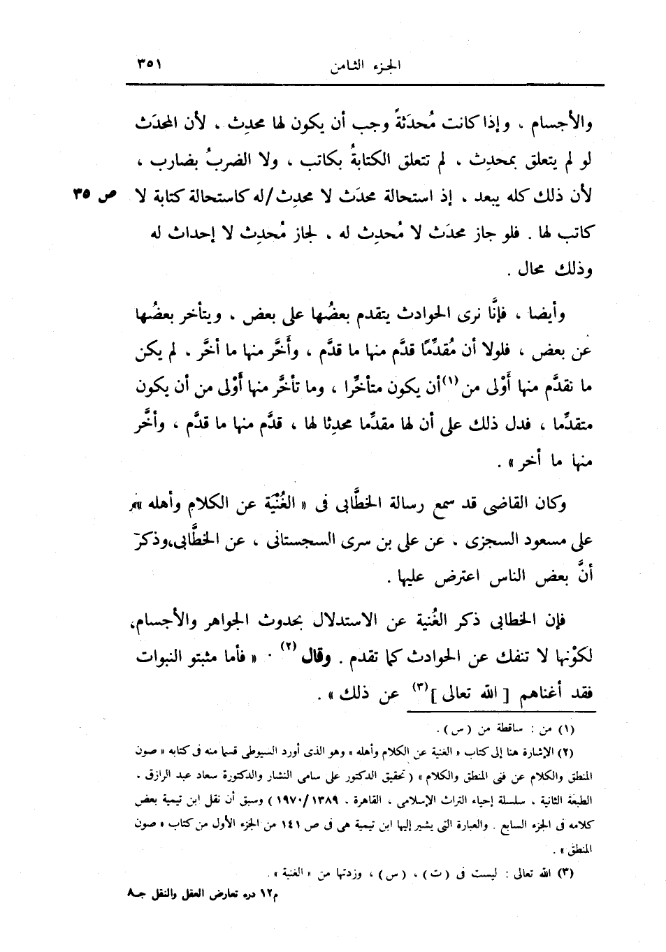 فإن الخطابي ذكر عن الغنية عن الاستدلال بحدوث الجواهر والأجسام، لكونها لا تنفك عن الحوادث كما تقدم.