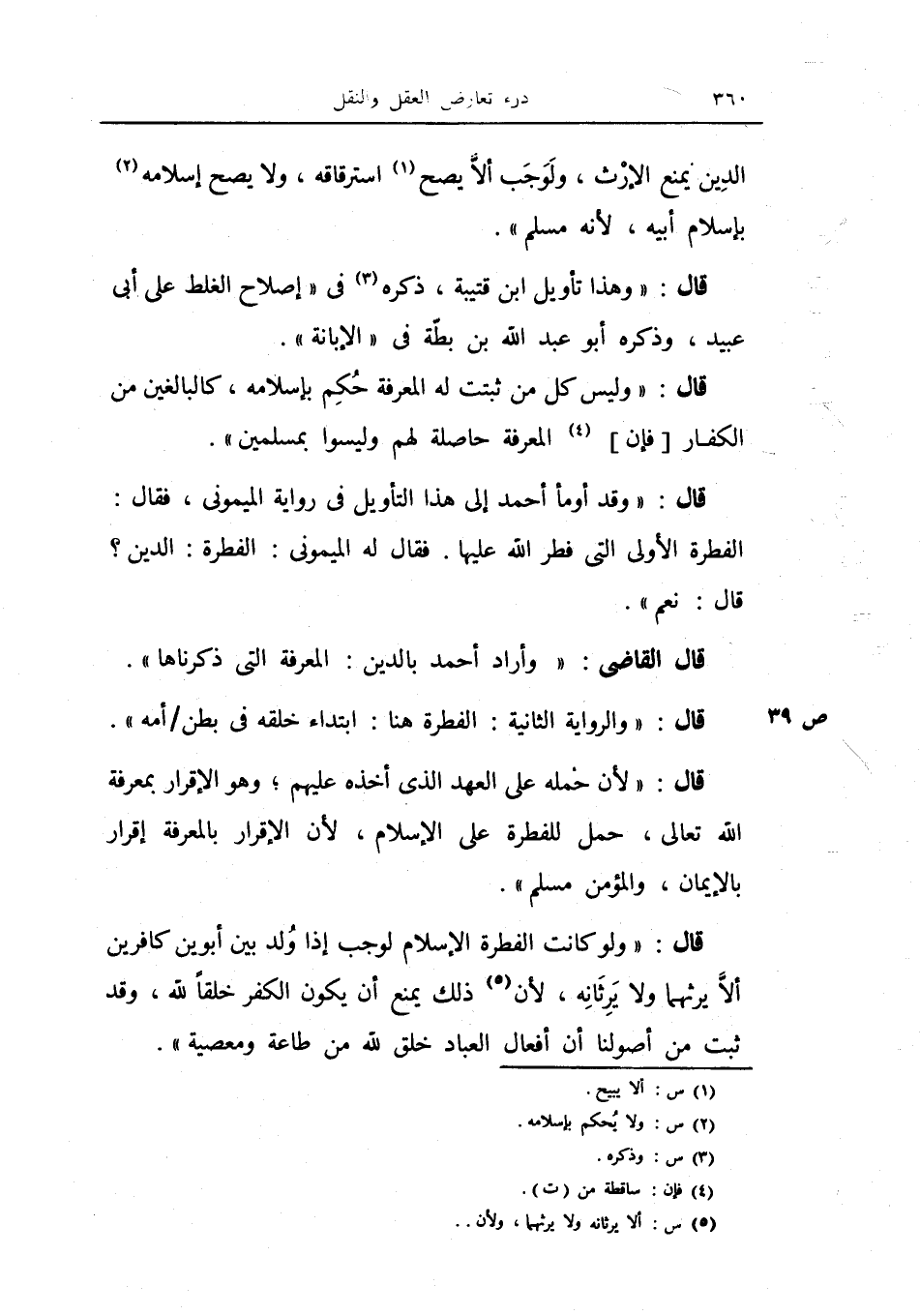 قال: (ولو كانت الفطرة الإسلام لوجب إذا ولد بين أبوين كافرين ألا يرثهما ولا يرثانه، لأن ذلك يمنع أن يكون الكفر خلقاً لله، وقد ثبت من أصولنا أن أفعال العباد خلق لله عن طاعة ومعصية) .