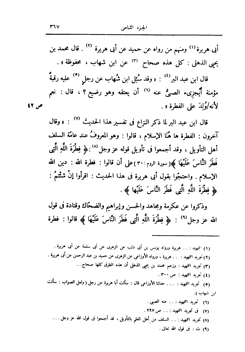 قال ابن عبد البر لما ذكر النزاع في تفسير هذا الحديث: (وقال آخرون: الفطرة ها هنا الإسلام، قالوا: وهوالمعروف عند عامة السلف أهل التأويل، وقد أجمعوا في تأويل قوله عز وجل: {فطرة الله التي فطر الناس عليها} ، على أن قالوا: فطرة الله: دين الله الإسلام.