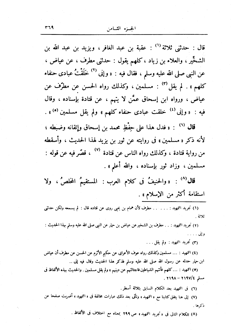 قال: حدثني ثلاثة: عقبة بن عبد الغافر، ويزيد بن عبد الله بن الشخير، والعلاء بن زياد، كلهم يقول: حدثني مطرف، عن عياض، عن النبي صلى الله عليه وسلم فقال فيه: «وإني خلقت عبادي حنفاء كلهم» .