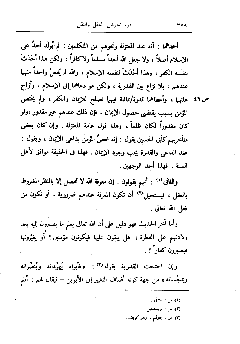 أحدهما: أنه عند المعتزلة ونحوهم من المتكلمين: لم يولد أحد على الإسلام أصلاً، ولا جعل الله أحداً مسلماً ولا كافراً، ولكن هذه أحدث لنفسه الكفر، وهذا أحدث لنفسه الإسلام، والله لم يفعل واحداً منهما عندهم، بلا نزاع بين القدرية، ولكن هو دعاهما إلى الأسلام، وأزاح علتهما، وأعطاهما قدرة مماثلة فيهما تصلح للإيمان والكفر، ولم يختص المؤمن بسبب يقتضي حصول الإيمان، فإن ذلك عندهم غير مقدور، ولو كان مقدوراً لكان ظلماً، وهذا قول عامة المعتزلة.