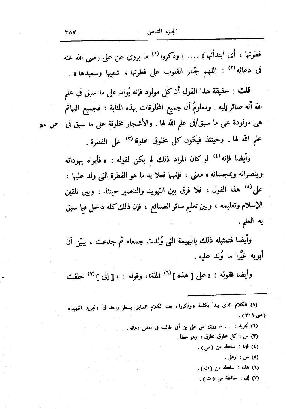 وأيضاً فإنه لو كان المراد ذلك لم يكن لقوله: «فأبواه يهودانه وينصرانه ويمجسانه» معنى، فإنهما فعلا به ما هو الفطرة التي ولد عليها، على هذا القول، فلا فرق بين التهويد والتنصير حينئذ، وبين تلقين الإسلام وتعليمه، وبين تعليم سائر الصنائع، فإن ذلك كله داخل فيما سبق به العلم.