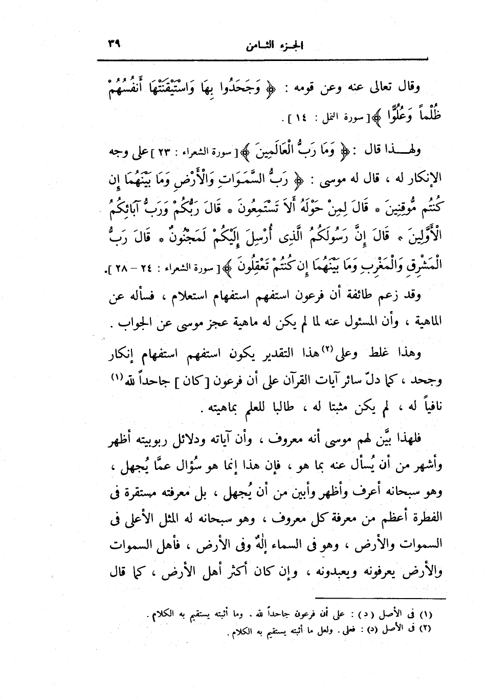 وهذا غلط وعلى هذا التقدير يكون استفهم استفهام إنكار وجحد، كما دل سائر آيات القرآن على أن فرعون كان جاحداً لله نافياً له، لم يكن مثبتاً له، طالباً للعلم بماهيته.