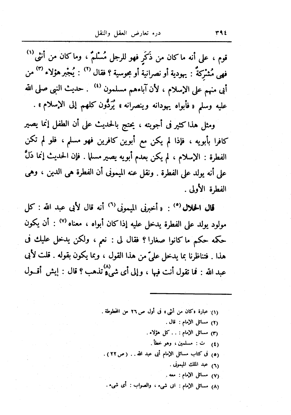 ومثل هذا كثير في أجوبته، يحتج بالحديث على أن الطفل إنما يصير كافراً بأبويه، فإن لم يكن مع أبوين كافرين فهو مسلم، فلو لم تكن الفطرة: الإسلام، لم يكن بعدم أبويه يصير مسلماً، فإن الحديث إنما دل على أنه يولد على الفطرة.