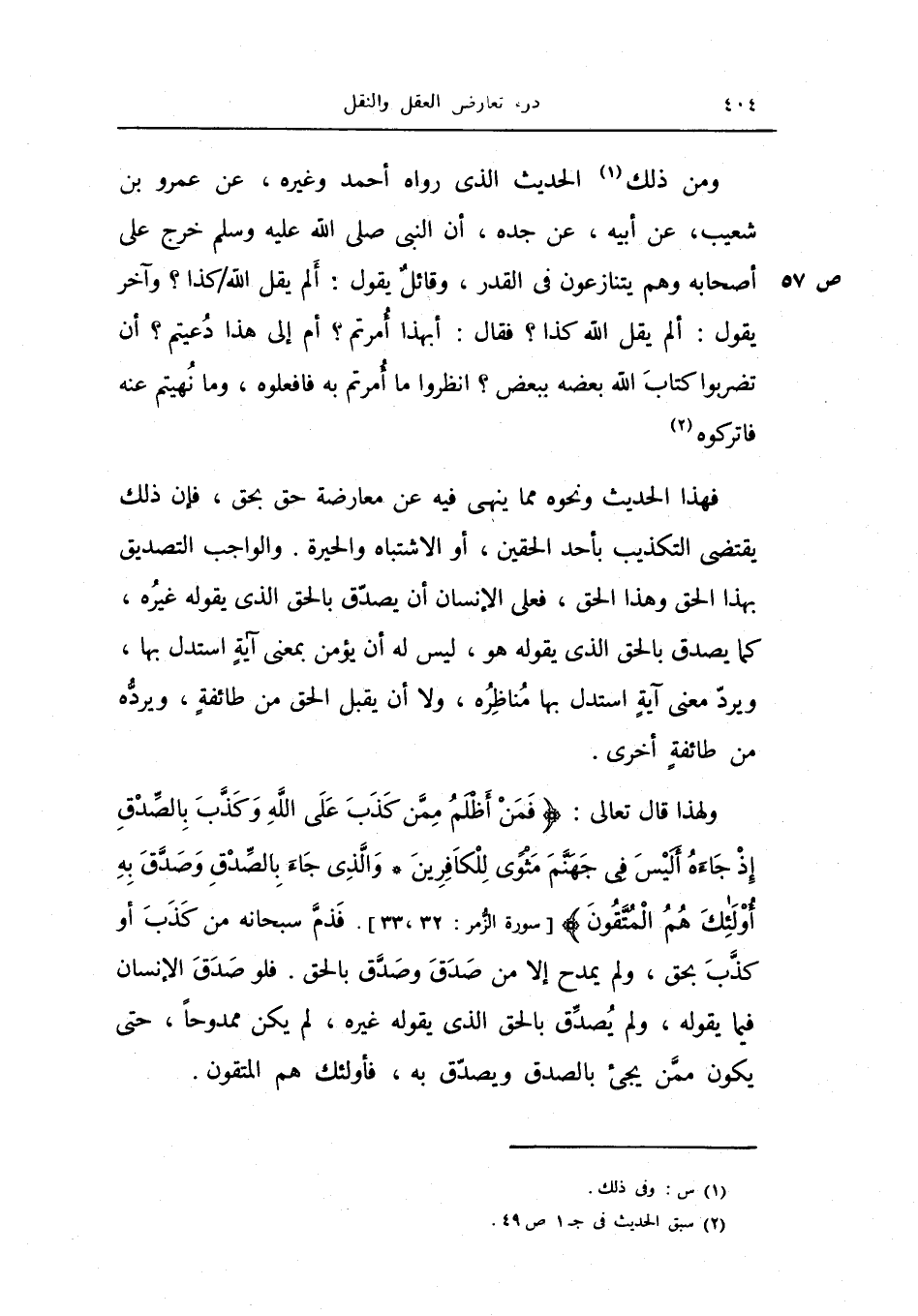 ومن ذلك الحديث الذي رواه أحمد وغيره، عن عمرو بن شعيب، عن أبيه، عن جده، أن النبي صلى الله عليه وسلم خرج على أصحابه وهم يتنازعون في القدر، وقائل يقول: ألم يقل الله كذا؟ وآخر يقول: ألم يقل الله كذا؟ فقال: أبهذا أمرتم؟ أم إلى هذا دعيتم؟ أن تضربوا كتاب الله بعضه ببعض؟ انظروا ما أمرتم به فافعلوه، وما نهيتم عنه فاتركوه.