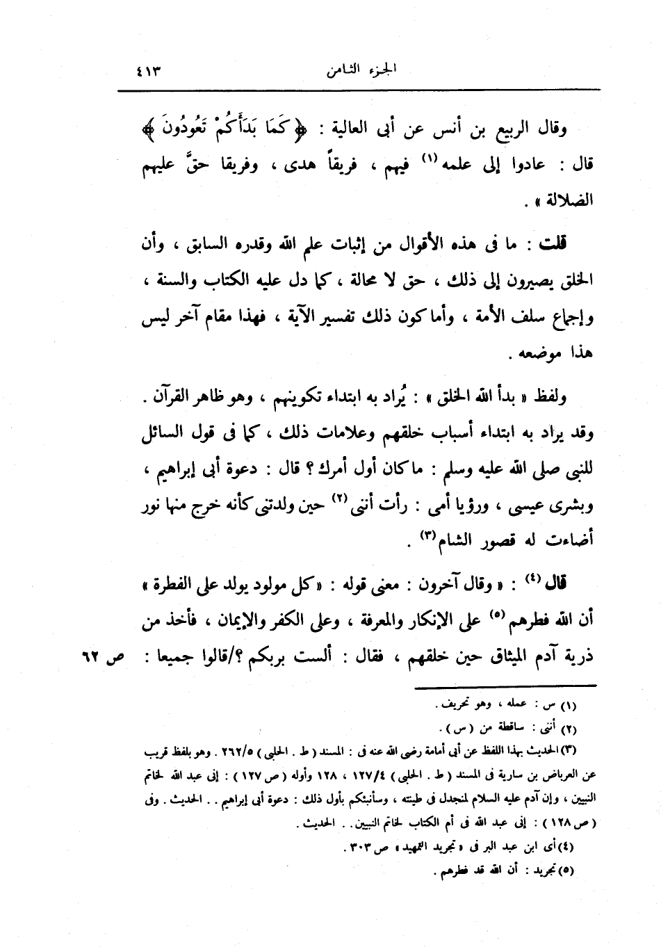 وقال الربيع أبن أنس عن أبي العالية: {كما بدأكم تعودون} قال: عادوا إلى علمه فيهم، فريقاً هدى، وفريقاً حق عليهم الضلالة) .