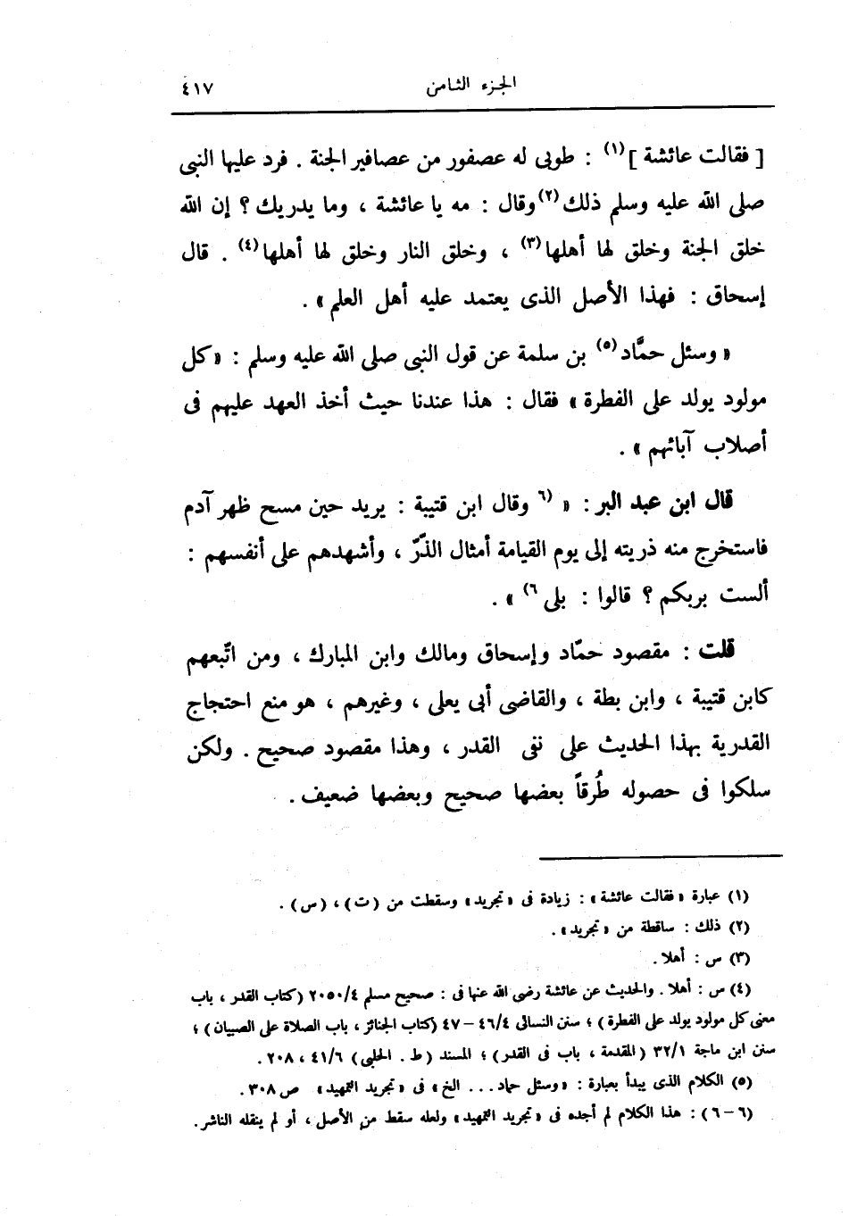 (وسئل حماد بن سلمة عن قول النبي صلى الله عليه وسلم: «كل مولود يولد على الفطرة» ، فقال: هذا عندنا حيث أخذ العهد عليهم في أصلاب آبائهم.