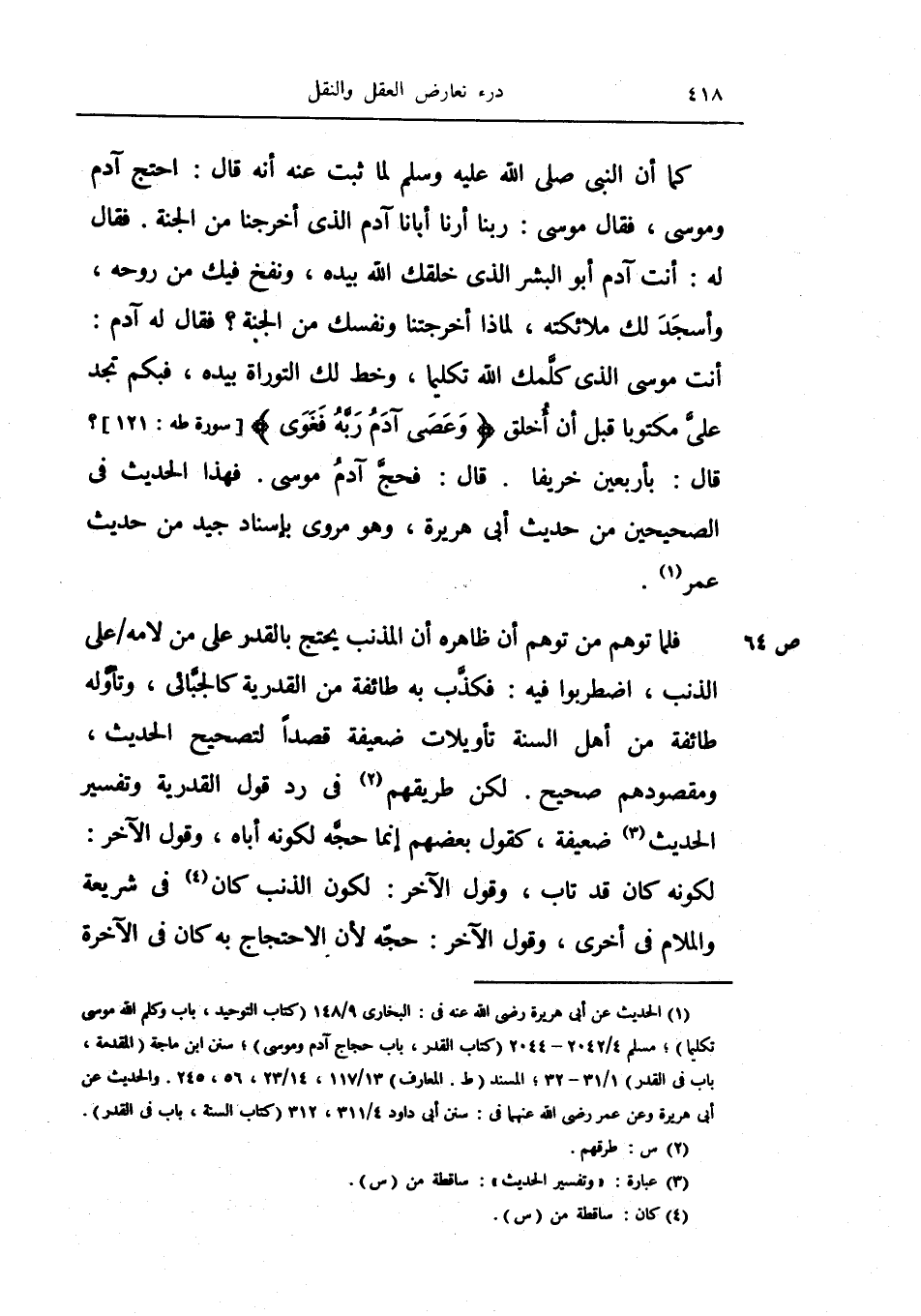لكن طريقهم في رد قول القدرية وتفسير الحديث ضعيفة، كقول بعضهم إنما حجه لكونه أباه، وقول الآخر: لكونه كان قد تاب، وقول الآخر: لكون الذنب كان في شريعة والملام في أخرى، وقول الآخر: حجة لأن الاحتجاج به كان في الآخرة