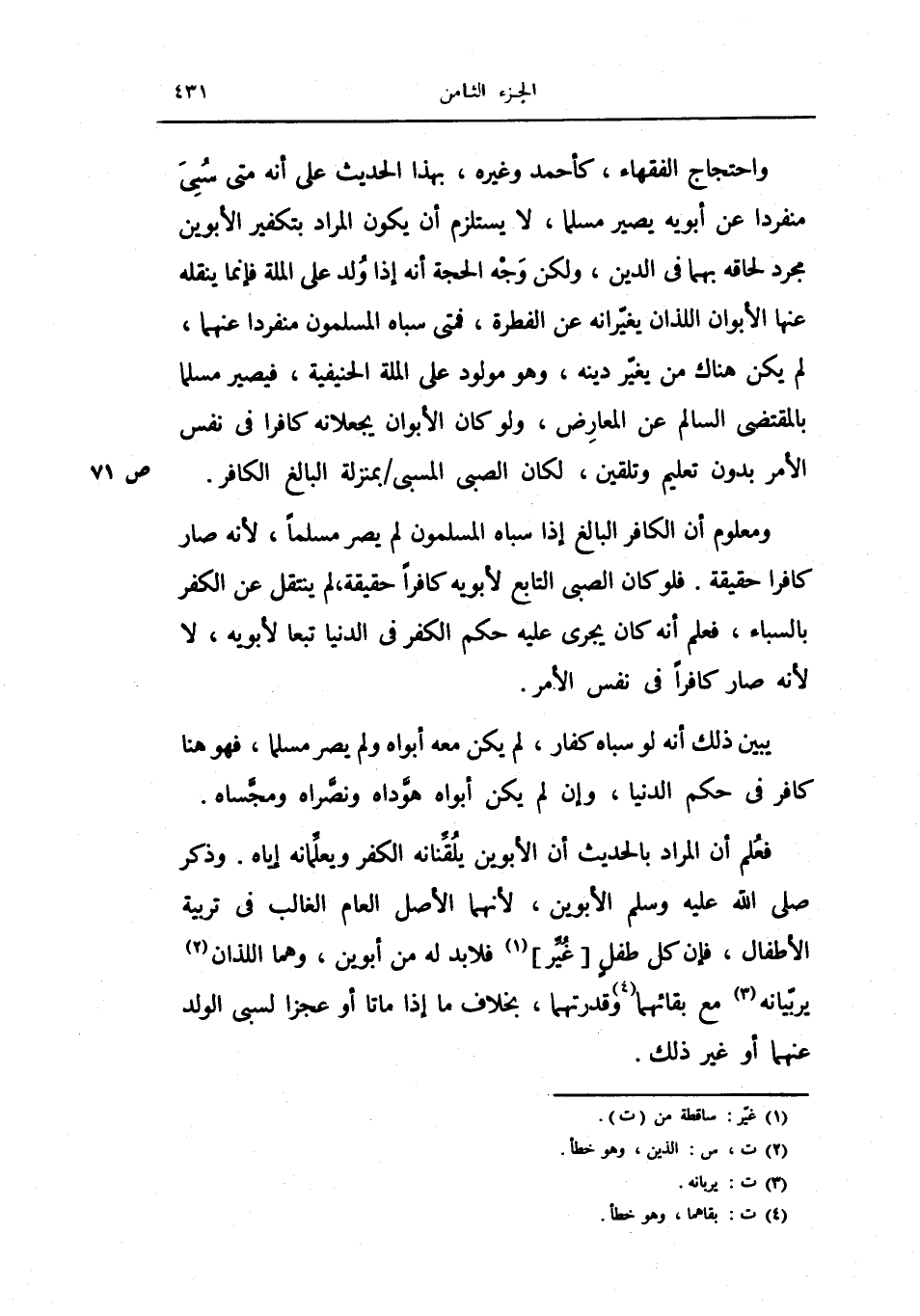 واحتجاج الفقهاء، كأحمد وغيرهم، بهذا الحديث على أنه متى سبي منفرداً عن أبويه يصير مسلماً، لا يستلزم أن يكون المراد بتكفير الأبوين مجرد لحاقه بهما في الدين، ولكن وجه الحجة أنه إذا ولد على الملة فإنما ينقله عنها الأبوان اللذان يغيرانه عن الفطره، فمتى سباه المسلمون منفرداً عنهما، لم يكن هناك من يغير دينها، وهو مولود على الملة الحنيفية، فيصير مسلماً بالمقتضى السالم عن المعارض، ولو كان الأبوان يجعلانه كافراً في نفس الأمر بدون تعليم وتلقين، لكان الصبي المسبى بمنزلة الكافر.