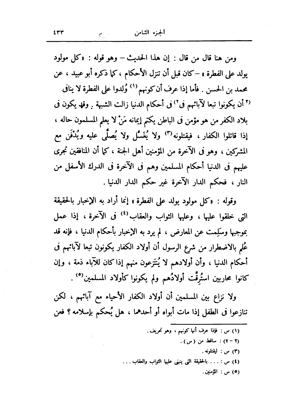ومن هنا قال من قال: إن هذا الحديث - هو قوله: «كل مولود يولد على الفطرة» كان قبل أن تنزل الأحكام، كما ذكره أبوعبيد، عن محمد بن الحسن، فأما إذا عرف أن كونهم ولدوا عى الفطرة لا ينافي أن يكونوا تبعاً، لآبائهم في أحكام الدنيا زالت الشبهة.