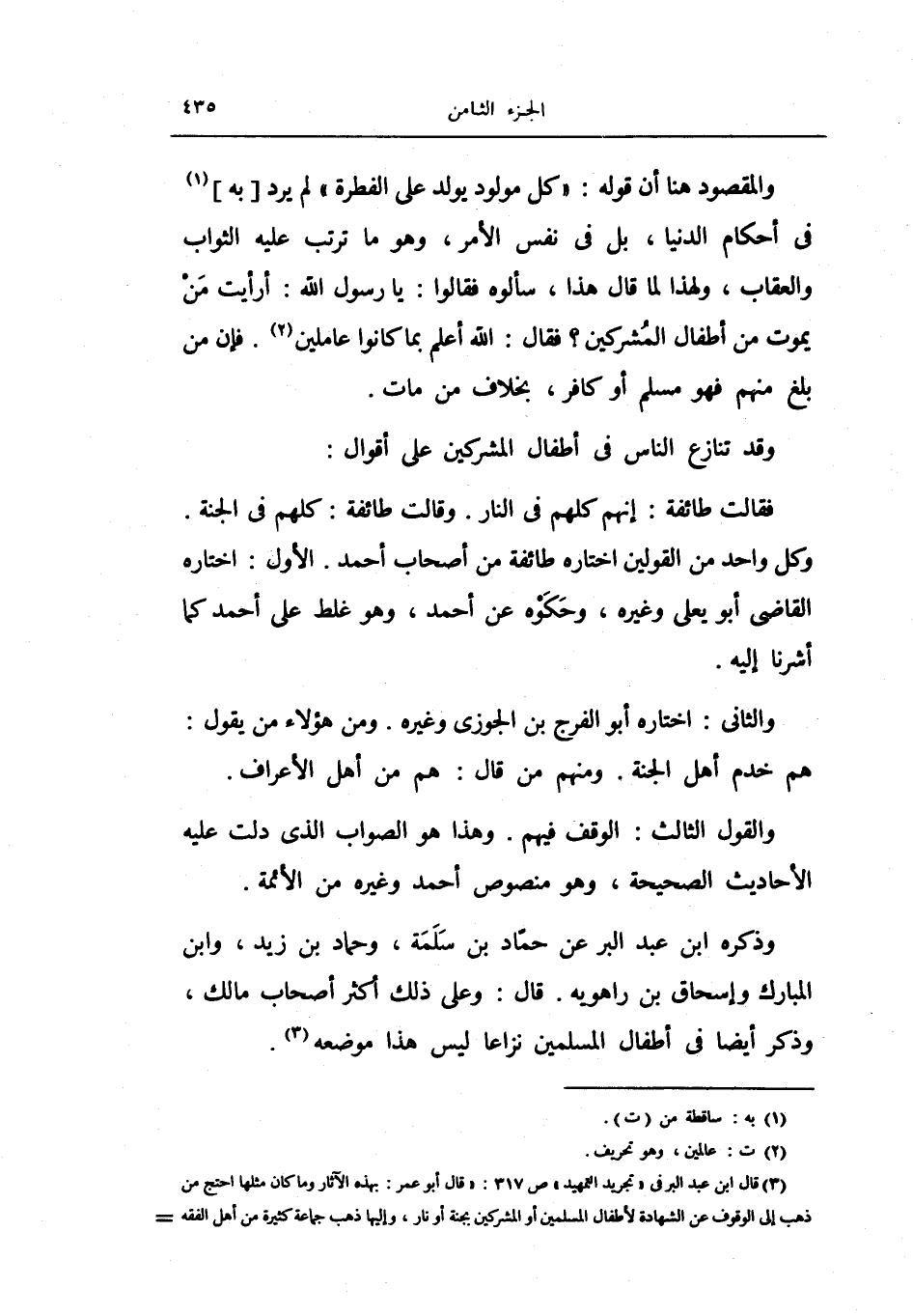 والمقصود هنا أن قوله: «كل مولود يولد على الفطرة» لم يرد به في أحكام الدنيا، بل في نفس الأمر، وهو ما يترتب عليه الثواب والعقاب، ولهذا لما قال هذا، سألوه فقالوا: يا رسول الله: أرأيت من يموت من أطفال المشركين؟ فقال: الله أعلم بما كانوا عاملين.