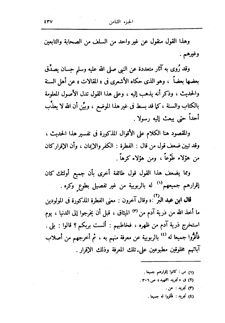قال ابن عبد البر: (وقال آخرون: معنى الفطرة المذكورة في المولدين ما أخذ الله من ذرية آدم من الميثاق، قبل أن يخرجوا إلى الدنيا، يوم استخرج ذرية آدم من ظهره، فخاطبهم: ألست بربكم؟ قالوا: بلى.