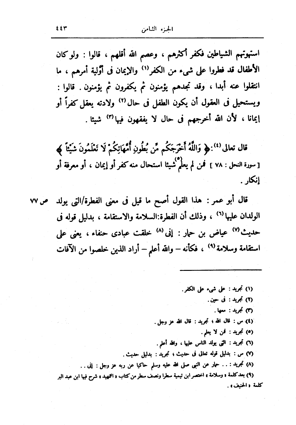 قال أبو عمر: هذا القول أصح ما قيل في معنى الفطرة التي يولد الولدان عليها، وذلك أن الفطرة: السلامة والاستقامة، بدليل قوله في حديث عياض بن حمار: إني خلقت عبادي حنفاء، يعني على استقامة وسلامة، فكأنه - والله أعلم - أراد الذين خلصوا من الآفات