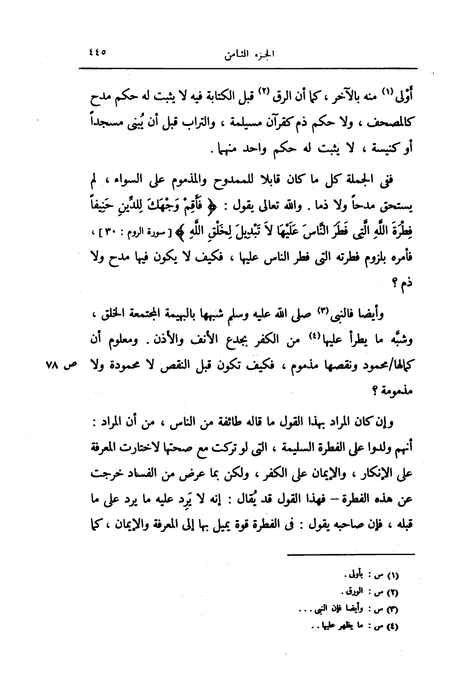 والله تعالى يقول: {فأقم وجهك للدين حنيفا فطرة الله التي فطر الناس عليها لا تبديل لخلق الله} ، فأمره بلزوم فطرته التي فطر الناس عليها، فكيف لا يكون فيها مدح ولا ذم؟.