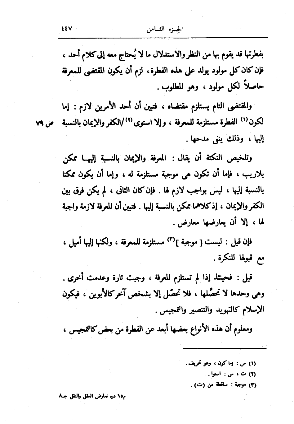بفطرتها قد يقوم بها من النظر والاستدلال مالا يحتاج معه إلى كلام أحد، فإن كان كل مولود يولد على هذه الفطرة، لزم أن يكون المقتضى للمعرفة حاصلاً لكل مولود، وهو المطلوب.