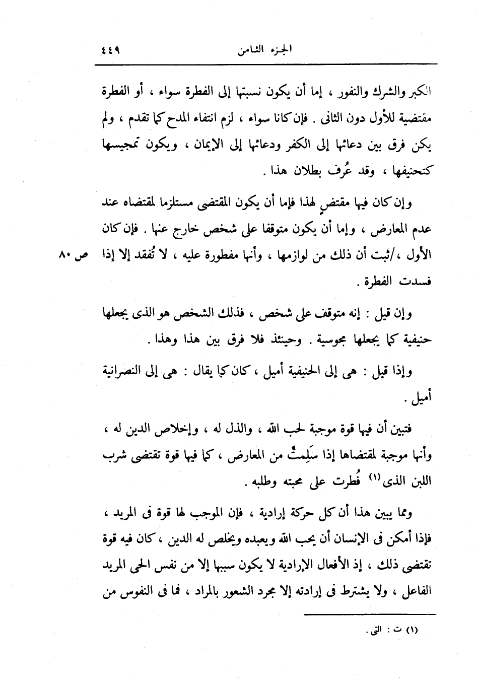 ومما يبين هذا أن كل حركة إرادية، فإن الموجب لها قوة في المريد، فإذا أمكن في الإنسان أن يحب الله ويعبده ويخلص له الدين، كان فيه قوة تقتضي ذلك، إذ الأفعال الإرادية لا يكون سببها إلا من نفس الحي المريد الفاعل، ولا يشترط في إرادته إلا مجرد الشعور بالمراد، فما في النفوس من