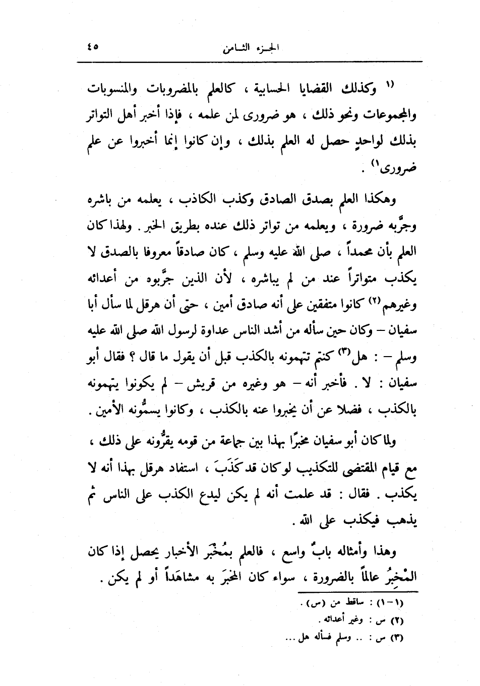 ولهذا كان العلم بأن محمداً صلى الله عليه وسلم، كان صادقاً معروفاً بالصدق لا يكذب متواتراً عند من لم يباشره، لأن الذين جربوه من أعدائه وغيرهم كانوا متفقين على أنه صادق أمين، حتى أن هرقل لما سأل أبا سفيان - وكان حين سأله من أشد الناس عداوة لرسول الله صلى الله عليه وسلم -: هل كنتم تتهمونه بالكذب قبل أن يقول ما قال؟ فقال أبو سفيان: لا.