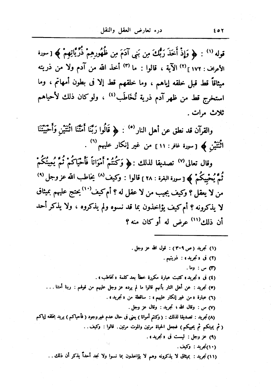 وقال تعالى تصديقاً لذلك: {وكنتم أمواتا فأحياكم ثم يميتكم ثم يحييكم} قالوا: وكيف يخاطب الله عز وجل من لا يعقل؟ وكيف يجيب من لا عقل له؟ أم كيف يحتج عليه بميثاق لا يذكرونه؟ أم كيف يؤاخذون بما قد نسوه ولم يذكروه، ولا يذكر أحد أن ذلك عرض له أو كان منه؟.