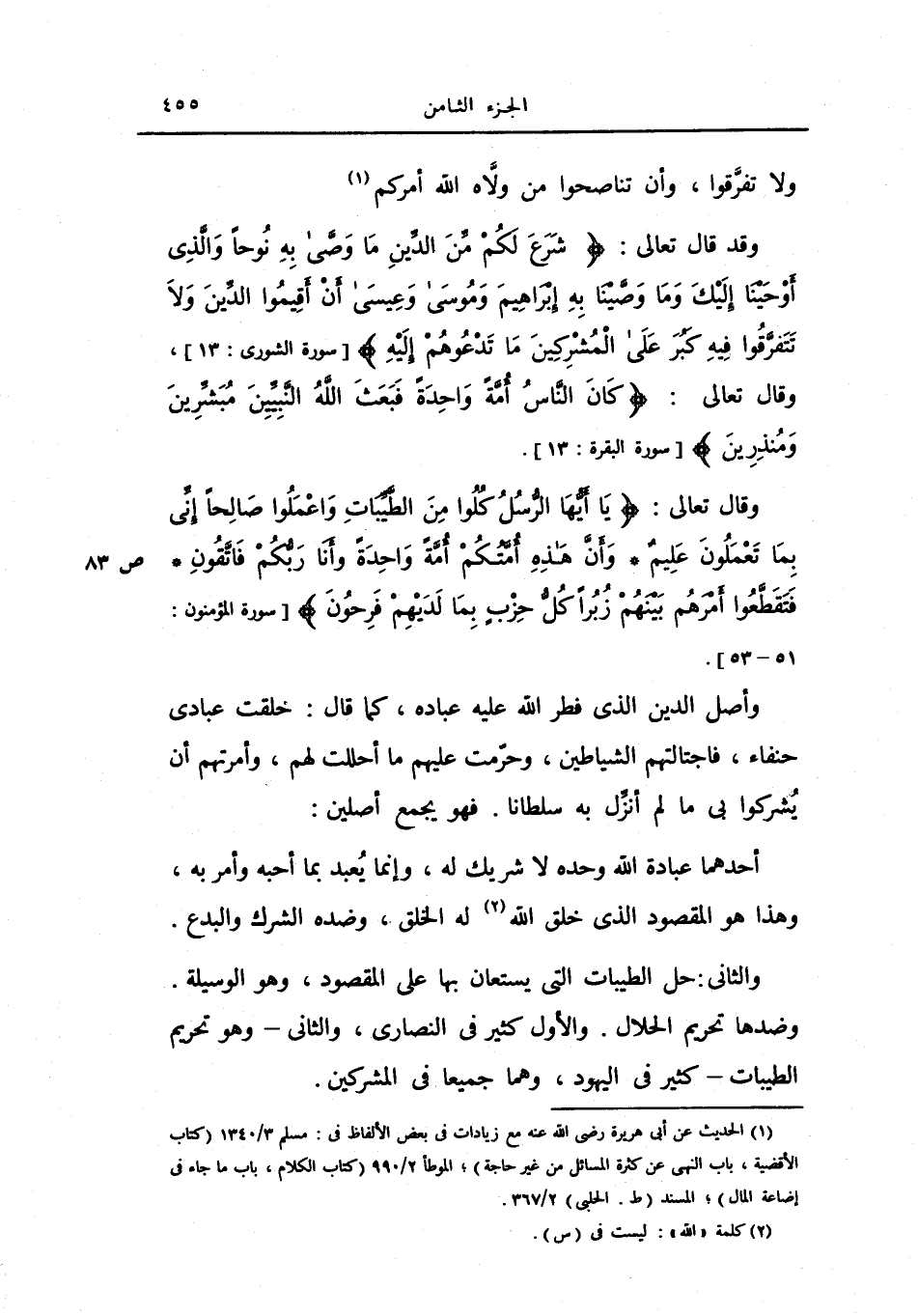 وقال تعالى: {يا أيها الرسل كلوا من الطيبات واعملوا صالحا إني بما تعملون عليم * وإن هذه أمتكم أمة واحدة وأنا ربكم فاتقون * فتقطعوا أمرهم بينهم زبرا كل حزب بما لديهم فرحون} .