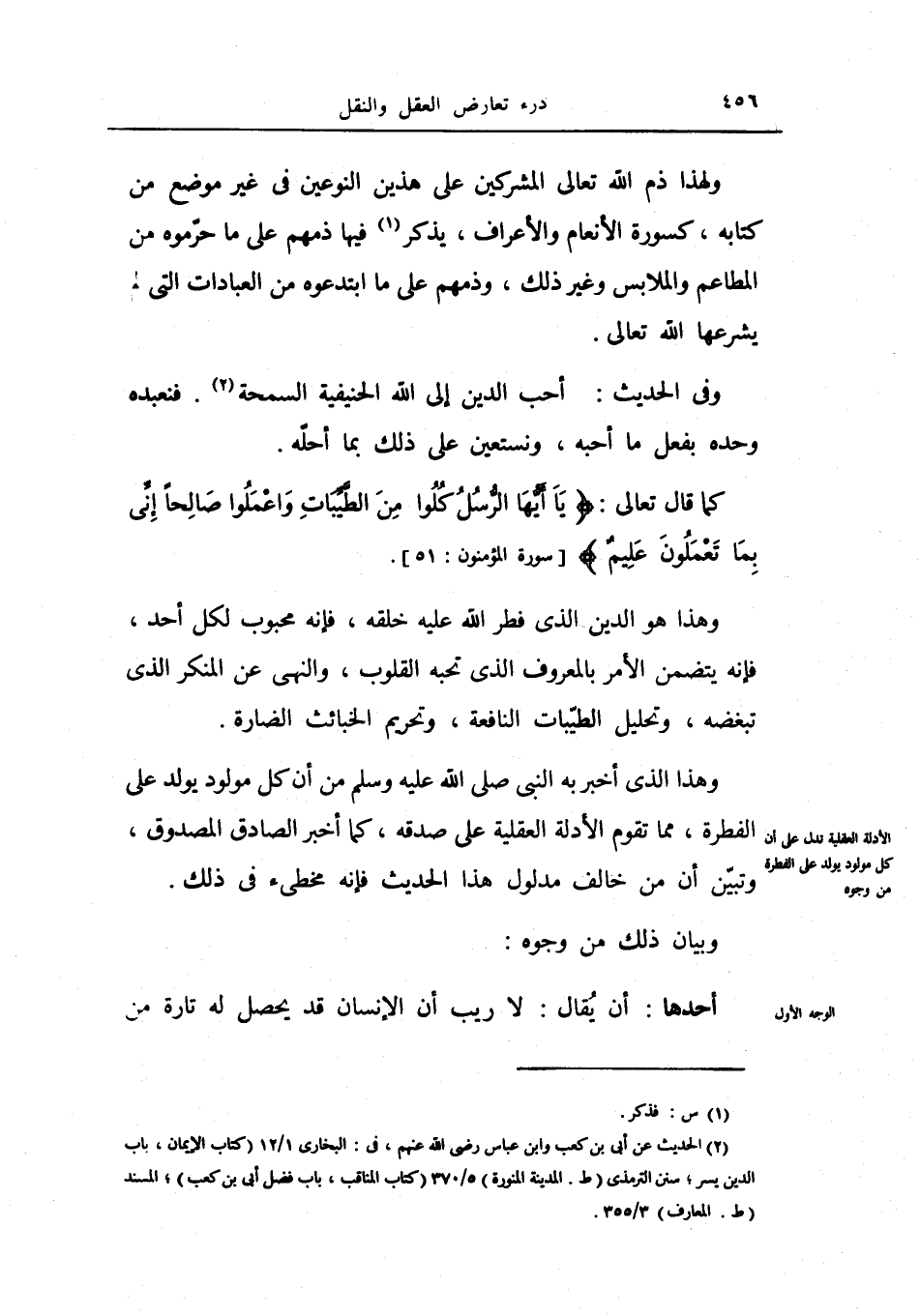 وهذا الذي أخبر به النبي صلى الله عليه وسلم من أن «كل مولود يولد على الفطرة» ، مما تقوم الأدلة العقلية على صدقه، كما أخبر الصادق المصدوق، وتبين أن من خالف مدلول هذا الحديث فإنه مخطىء في ذلك.