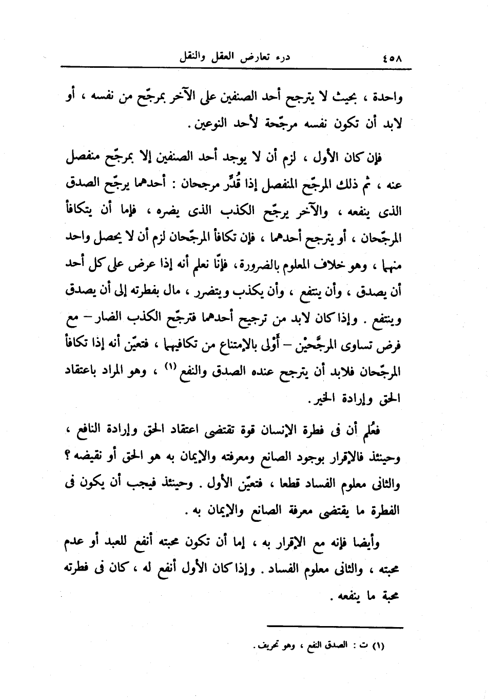 فإن كان الأول، لزم أن لا يوجد أحد الصنفين إلا بمرجح منفصل عنه، ثم ذلك المرجح المنفصل إذا قدر مرجحان: أحدها يرجح الصدق الذي ينفعه، والآخر يرجح الكذب الذي يضره، فإما أن يتكافأ المرجحان، أويترجح أحدهما، فإن تكافأ المرجحان لزم أن لا يحصل واحد منهما، وهو خلاف المعلوم بالضرورة، فإنا نعلم أنه إذا عرض على كل أحد أن يصدق، وأن ينتفع، وأن يكذب وتضرر، مال بفطرته إلى أن يصدق وينتفع وإذا كان لا بد من ترجيح أحدهما فترجح الكذب الضار - مع فرض تساوى المرجحين أولى بالامتناع من تكافيهما، فعين أنه تكافأ المرجحان فلا بد أن يترجح عنده الصدق والنفع، وهو المراد باعتقاد الحق وإرادة الخير.