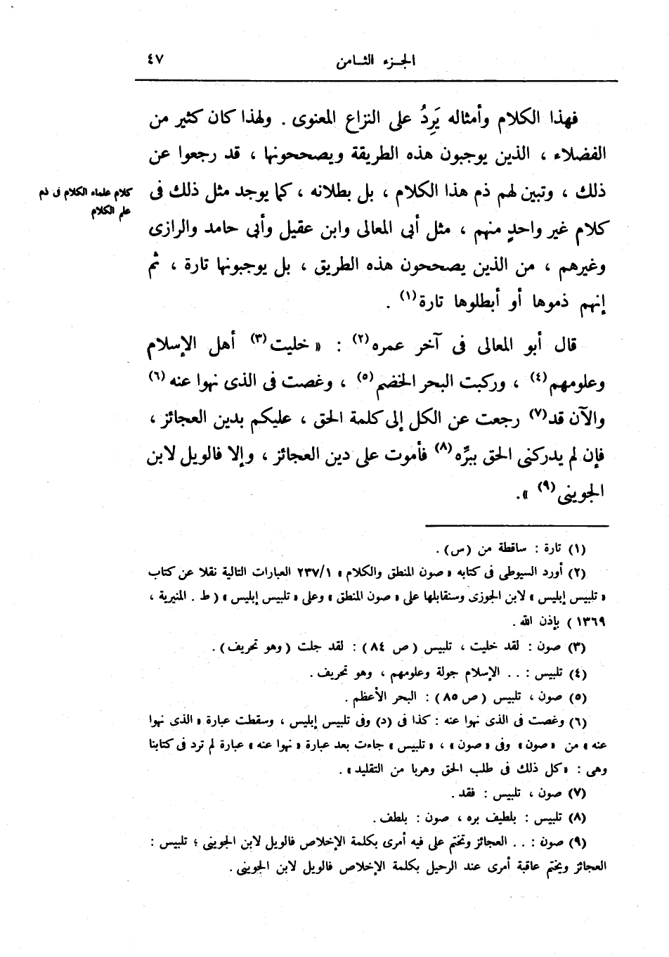 قال أبو المعالي في آخر عمره: (خليت أهل الإسلام وعلومهم، وركبت البحر الخضم، وغصت في الذي نهوا عنه والآن قد رجعت عن الكل إلى كلمة الحق، عليكم بدين العجائز، فإن لم يدركني الحق ببره فأموت على دين العجائز، وإلا فالويل لابن الجويني) .