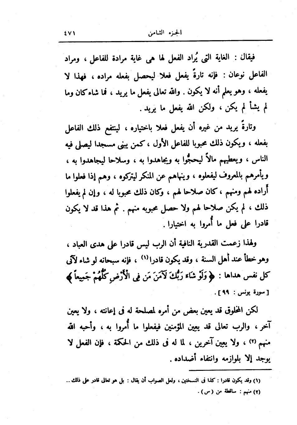 ولهذا زعمت القدرية النافية أن الرب ليس قادراً على هدي العباد، وهو خطأ عند أهل السنة، وقد يكون قادراً، فإنه سبحانه لو شاء لآتى كل نفس هداها: {ولو شاء ربك لآمن من في الأرض كلهم جميعا} .