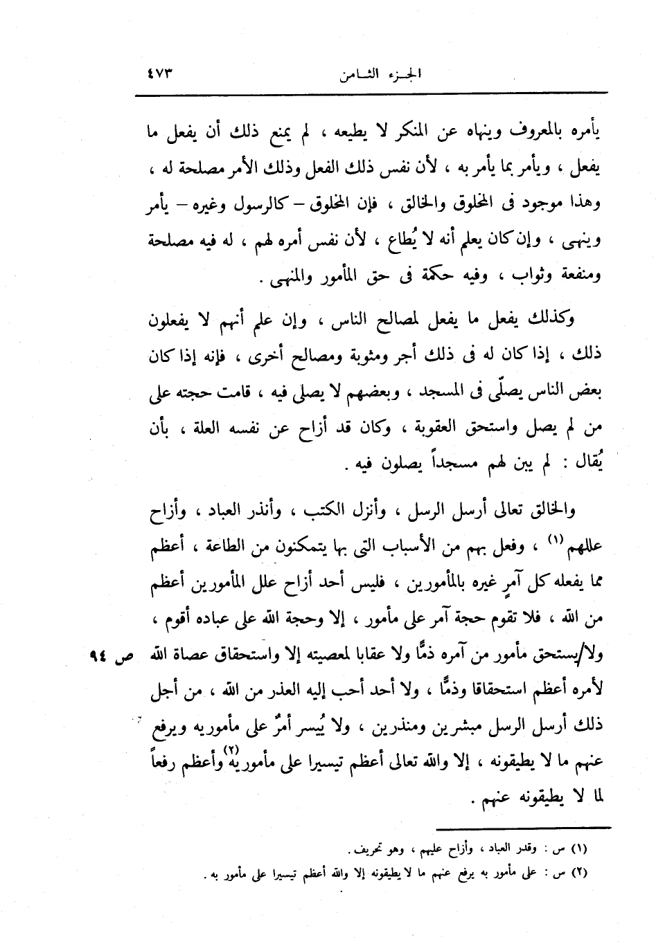 والخالق تعالى أرسل الرسل، وأنزل الكتب، وأنذر العباد، وأزاح عللهم، وفعل لهم من الأسباب التي بها يتمكنون من الطاعة، أعظم مما يفعله كل آمر غيره بالمأمورين، فليس أحد أزاح علل المأمورين أعظم من الله، فلا تقوم حجة آمر على مأمور، إلا وحجة الله على عباده أقوام، ولا يستحق مأمور من آمره ذماً ولاعقاباً لمعصيته إلا واستحقاق عصاة الله لأمره أعظم استحقاقاً وذماً، ولا أحد أحب إليه العذر من الله، من أجل ذلك أرسل الرسل مبشرين ومنذرين، ولا ييسر أمر على مأموريه ويرفع عنهم ما لا يطيقونه، إلا والله تعالى أعظم تيسيراً على مأموريه وأعظم رفعاً لما لا يطيقونه عنهم.