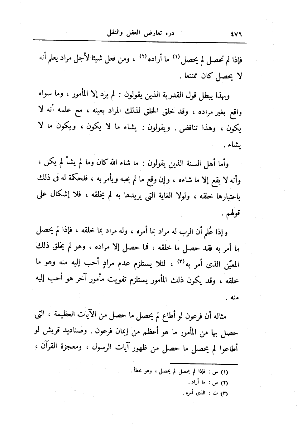 وإذا علم أن الرب له مراد بما أمره، وله مراد بما خلقه، فإذا لم يحصل ما أمر به فقد حصل ما خلقه، فما حصل إلا مراده، وهو لم يخلق ذلك المعين الذي أمر به، لئلا يستلزم عدم مراد أحب إليه منه وهو ما خلقه، وقد يكون ذلك المأمور يستلزم تفويت مأمور آخر هو أحب إليه منه.