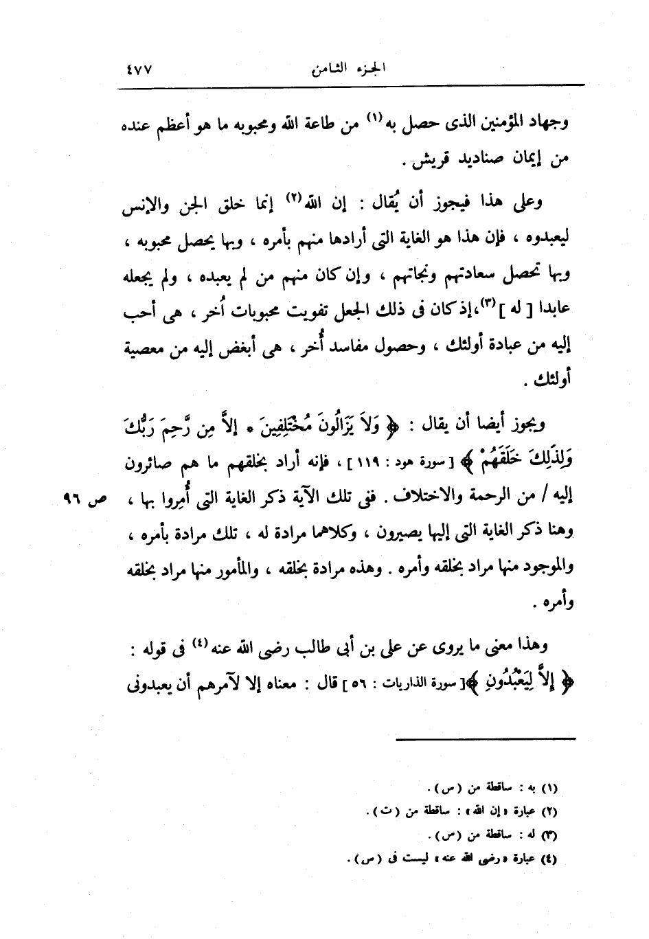 وعلى هذا فيجوز أن يقال: إن الله إنما خلق الجن والإنس ليعبدوه، فإنه هذا هو الغاية التي أرادها منهم بأمره، وبها يحصل محبوبه، وبها تحصل سعادتهم ونجاتهم، وإن كان منهم من لم يعبده، ولم يجعله عابداً له، إذا كان في ذلك الجعل تفويت محبوبات أخر، هي أحب إليه من عبادة أولئك، وحصول مفاسد أخر، هي أبغض إليه من معصية أولئك.