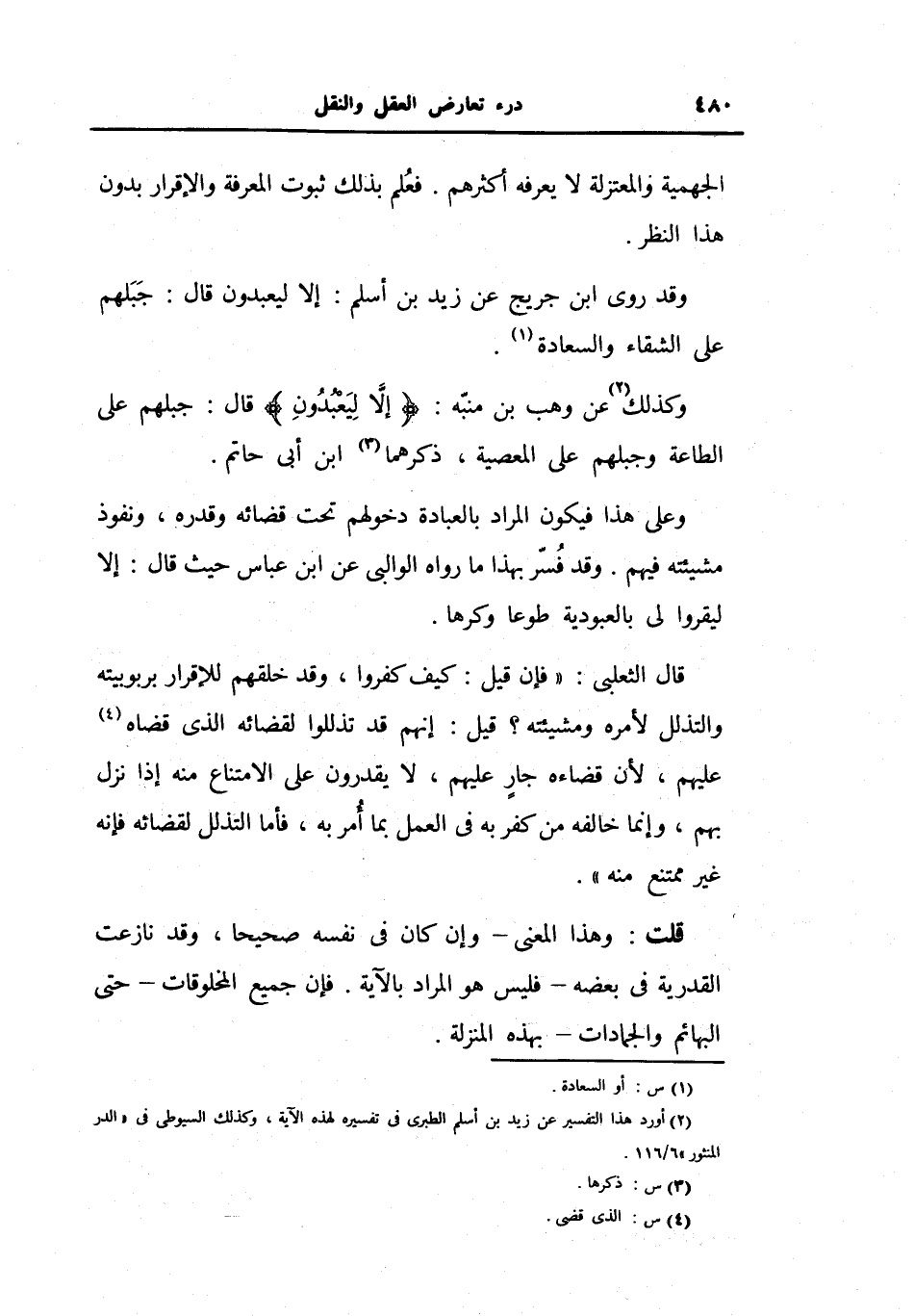 وكذلك عن وهب بن منبه: {إلا ليعبدون} قال: جبلهم على الطاعة وجبلهم على المعصية، ذكرهما ابن أبي حاتم؟