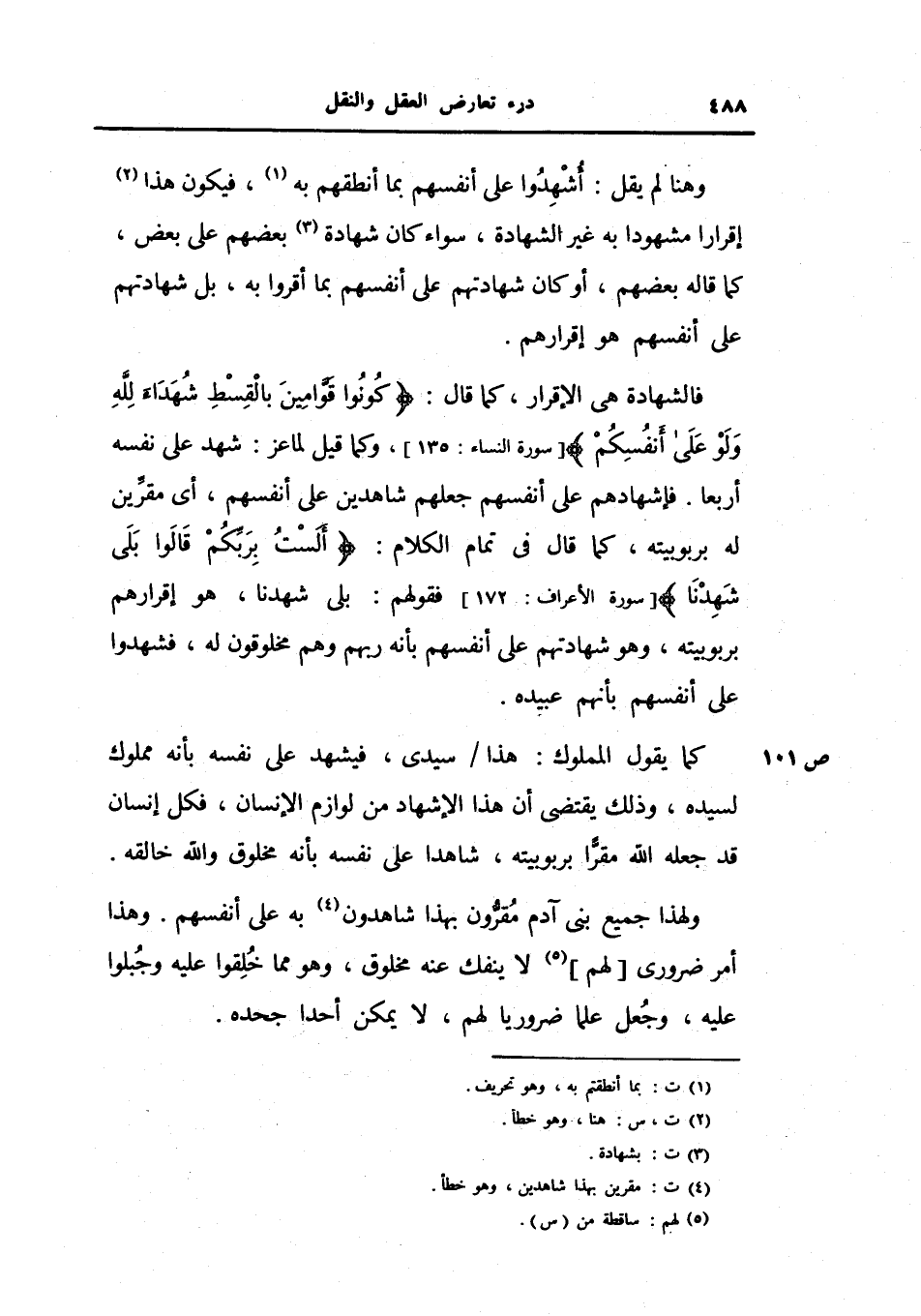 كما يقول الملوك: هذا سيدي، فيشهد على نفسه بأنه مملوك لسيده، وذلك يقتضي أن هذا الإشهاد من لوازم الإنسان، فكل إنسان قد جعله الله مقراً بربوبيته، شاهداً على نفسه بأنه مخلوق والله خالقه.