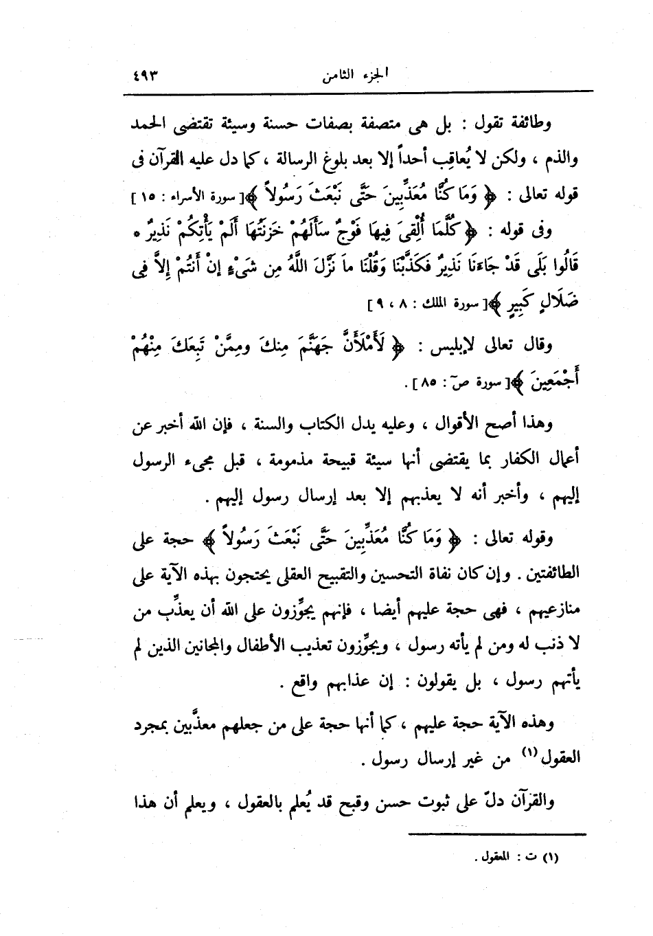 وإن كان نفاة التحسين والتقبيح العقلي يحتجون بهذه الآية على منازعيهم، فهي حجة عليهم أيضاً فإنهم يجوزون على الله أن يعذب من لا ذنب له ومن لم يأته رسول، ويجوزون تعذيب الأطفال والمجانين الذي لم يأتهم رسول، بل يقولون: إن عذابهم واقع.