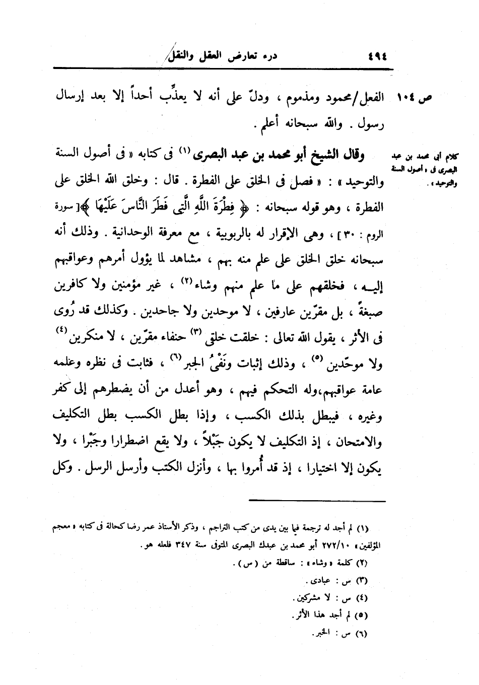 وقال الشيخ أبو محمد بن عبد البصري في كتابه في أصول السنة والتوحيد: (فصل في الخلق على الفطرة.