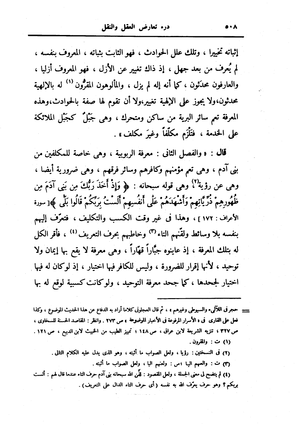 قال: (والفصل الثاني: معرفة الربوبية، وهي خاصة للمكلفين من بني آدم، وهي تعم مؤمنهم وكافرهم وسائر فرقهم، وهي ضرورية أيضاً، وهي عن رؤية، وهي قوله سبحانه: {وإذ أخذ ربك من بني آدم من ظهورهم ذريتهم وأشهدهم على أنفسهم ألست بربكم قالوا بلى} ، وهذا في غير وقت الكسب والتكليف، فتعرف إليهم بنفسه بلا وسائط ولقنهم التاء وخاطبهم بحرف التعريف، فأقر الكل له بتلك المعرفة، إذ عاينوه جباراً قهاراً، وهي معرفة لا يقع بها إيمان ولا توحيد، لأنها إقرار للضرورة، وليس للكافر فيها اختيار، إذ لو كان له فيها اختيار لجحدها، كما جحد معرفة التوحيد، ولو كانت كسبية لوقع له بها