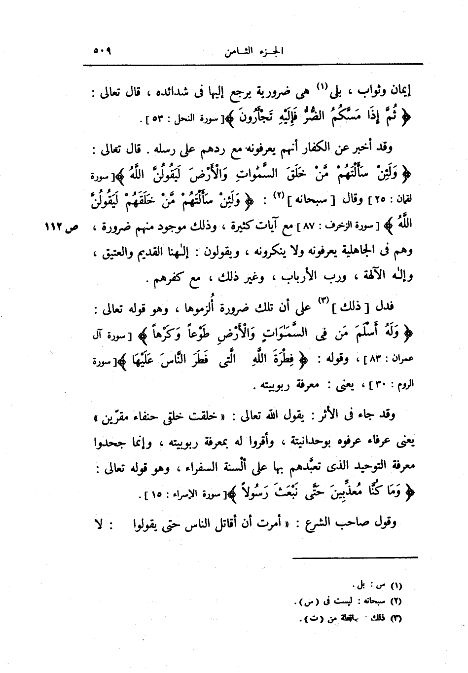 قال تعالى: {ولئن سألتهم من خلق السماوات والأرض ليقولن الله} ، وقال سبحانه: {ولئن سألتهم من خلقهم ليقولن الله} ، مع آيات كثيرة، وذلك موجود منهم ضرورة، وهم في الجاهلية يعرفونه ولا ينكرونه، ويقولن: إلهنا القديم والعتيق، وإله الآلهة، ورب الأرباب، وغير ذلك، مع كفرهم.