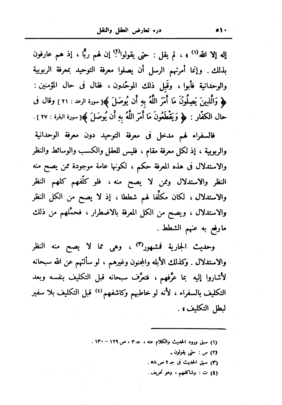 فالسفراء لهم مدخل في معرفة التوحيد دون معرفة الوحدانية والربوبية، إذ لكل معرفة مقام، فليس للعقل والكسب والوسائط والنظر والاستدلال في هذه المعرفة حكم، لكونها عامة موجودة ممن يصح منه النظر والاستدلال وممن لا يصح منه، فلو كلفهم كلهم النظر والاستدلال، لكان مكلفاً لهم شططاً، إذ لايصح من الكل النظر والاستدلال، ويصح من الكل المعرفة بالاضطرار، فحملهم من ذلك ما رفع به عنهم الشطط.