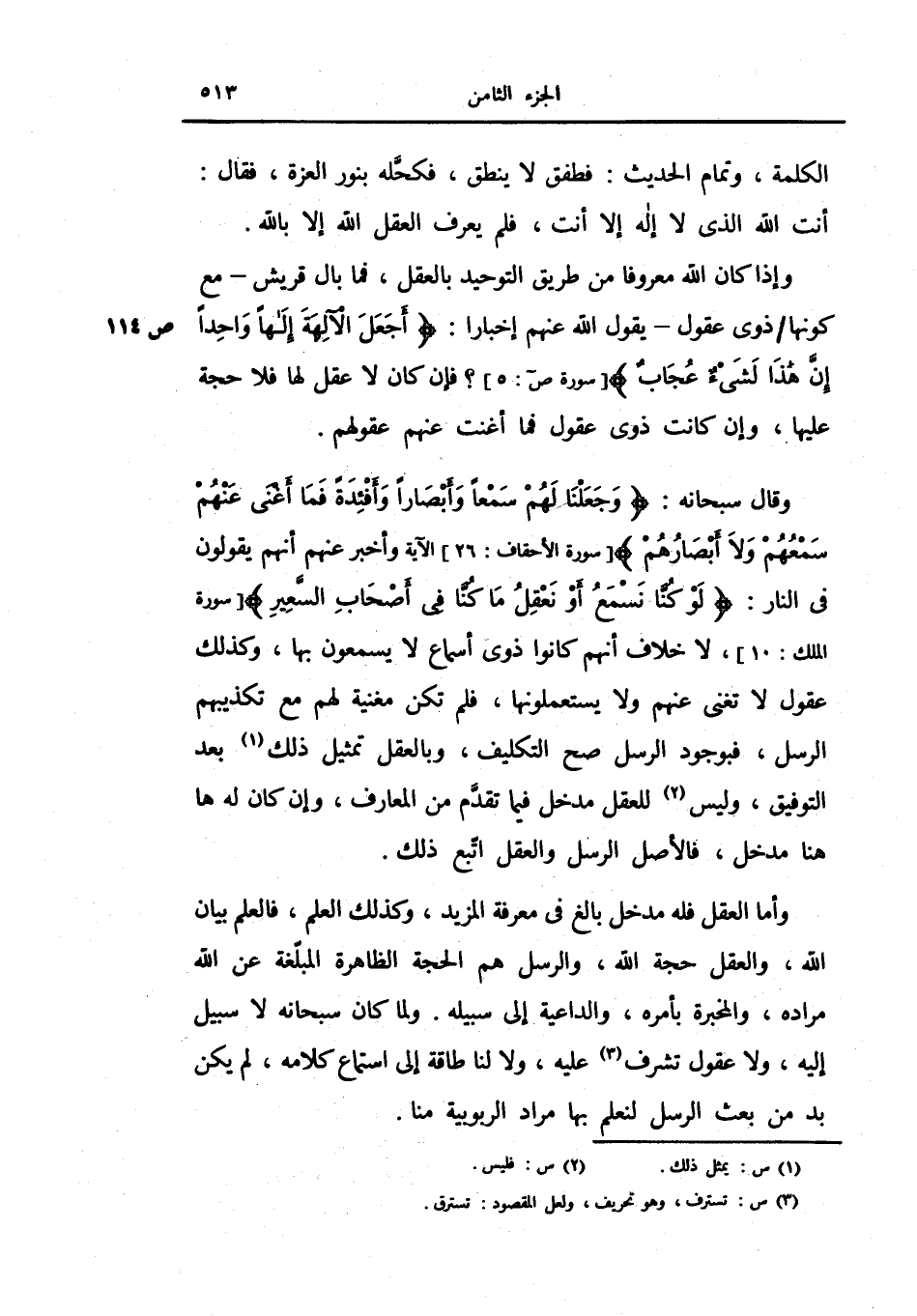 وقال سبحانه: {وجعلنا لهم سمعا وأبصارا وأفئدة فما أغنى عنهم سمعهم ولا أبصارهم} الآية، وأخبر عنهم أنهم يقولون في النار: {لو كنا نسمع أو نعقل ما كنا في أصحاب السعير} ، لا خلاف أنهم كانوا ذوي أسماع لا يسمعون بها، وكذلك عقول لا تغني عنهم ولا يستعملونها، فلم تكن مغنية لهم مع تكذيبهم الرسل، فبوجود الرسل صح التكليف، وبالعقل تمثيل ذلك بعد التوفيق، وليس للعقل مدخل فما تقدم من المعارف، وإن كان له ها هنا مدخل، فالأصل الرسل والعقل اتبع ذلك.