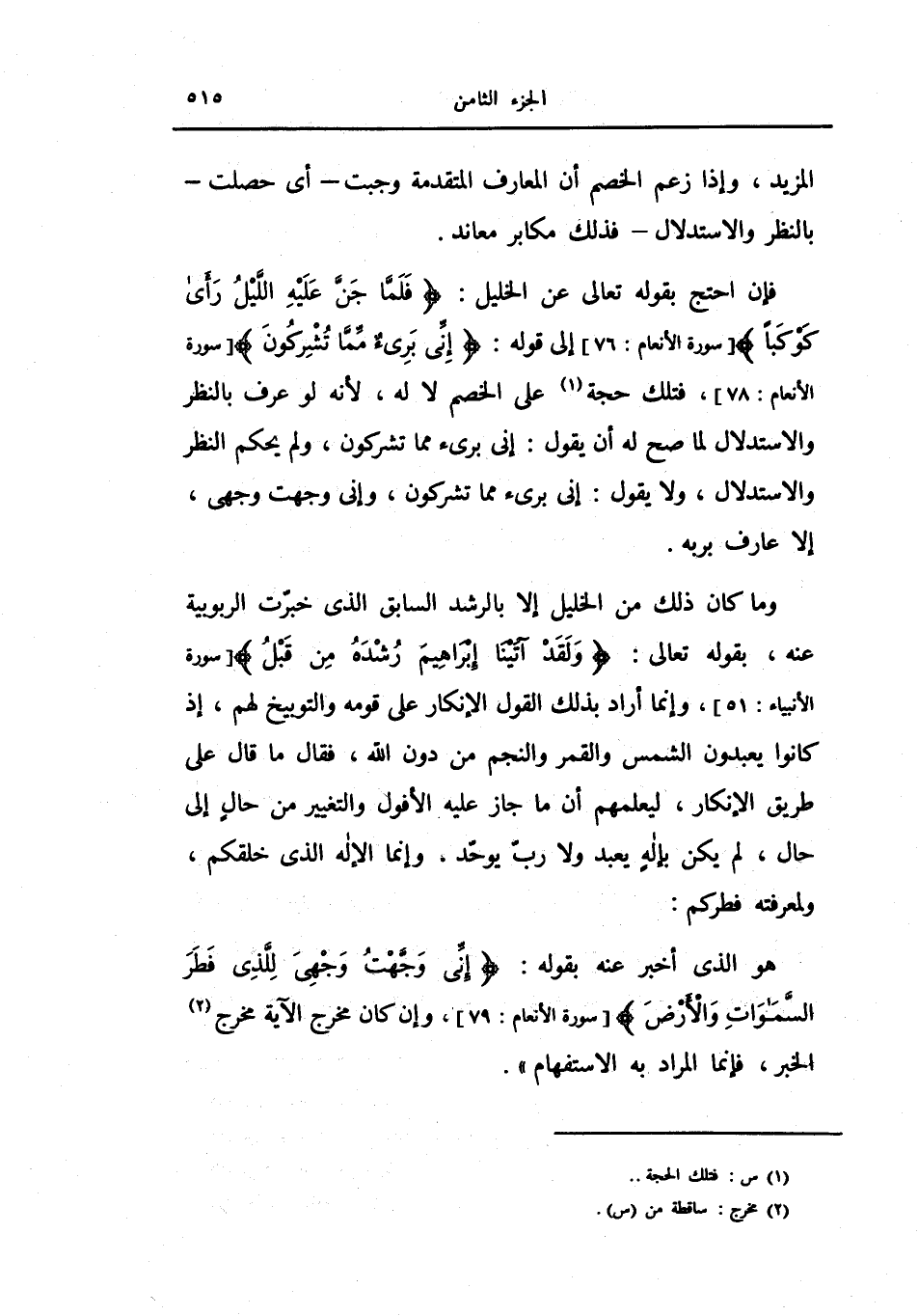 وما كان ذلك من الخليل إلا بالرشد السابق الذي خبرت الربوبية عنه، بقوله تعالى: {ولقد آتينا إبراهيم رشده من قبل} ، وإنما أراد بذلك القول الإنكار على قومه والتوبيخ لهم، إذ كانوا يعبدون الشمس والقمر والنجم من دون الله، فقال ما قال على طريق الإنكار ليعلمهم أن ما جاز عليه الأفول والتغيير من حال إلى حال، لم يكن بإله يعبد ولا رب يوحد.