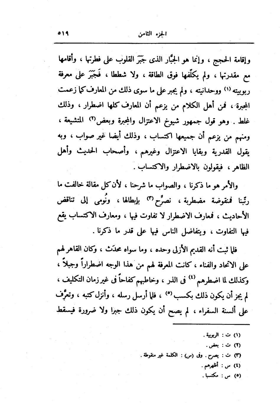 والأمر هو ما ذكرنا، والصواب ما شرحنا، لأن كل مقالة خالفت ما رتبنا فمنقوضة مضطربة، نصرح بإبطالها، ونومي إلى تناقض الأحاديث، فمعارف الاضطرار لا تفاوت فيها، ومعارف الاكتساب يقع فيها التفاوت، ويتفاضل الناس فيها على قدر ما ذكرنا.