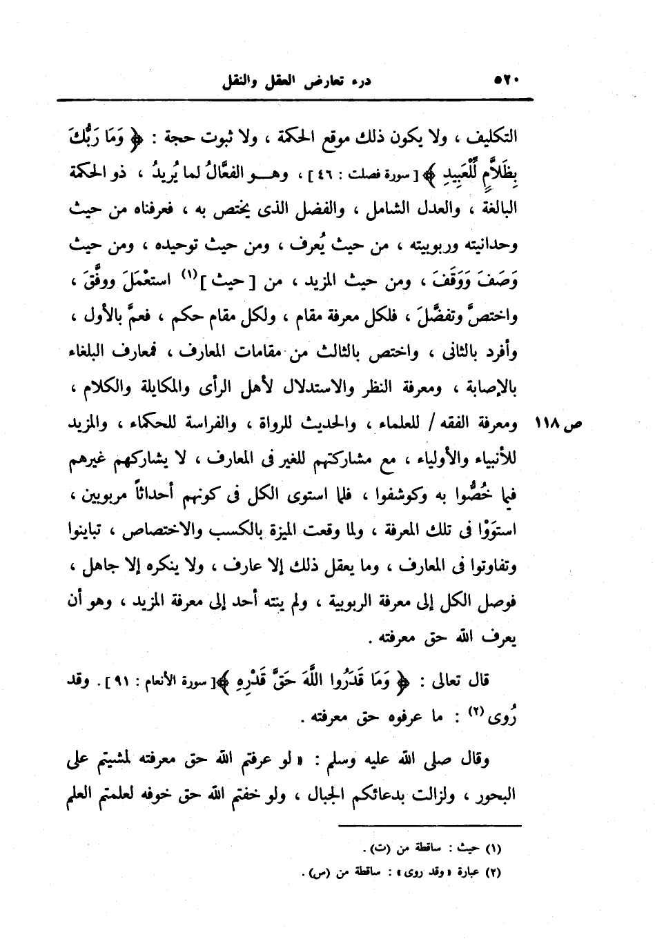 التكليف، ولا يكون ذلك موقع الحكمة، ولا ثبوت حجة: {وما ربك بظلام للعبيد} ، وهو الفعال لما يريد، ذو الحكمة البالغة، والعدل الشامل، والفضل الذي يختص به، فعرفناه من حيث وحدانيته وربوبيته، من حيث يعرف، ومن حيث توحيده، ومن حيث وصف ووقف، ومن حيث المزيد، من حيث استعمل ووفق، واختص وتفضل، فلكل معرفة مقام، ولكل مقام حكم، فعم بالأول، وأفراد بالثاني، واختص بالثالث من مقامات المعارف، فمعارف البلغاء بالإصابة، ومعرفة النظر والاستدلال لأهل الرأي والمكايلة والكلام، ومعرفة الفقه للعلماء، والحديث للرواة، والفراسة للحكماء، والمزيد للأنبياء والأولياء، مع مشاركتهم للغير في المعارف، لا يشاركهم غيرهم فيما خصوا به وكوشفوا، فلما استوى الكل في كونهم أحداثاً مربوبين، استووا في تلك المعرفة، ولما وقعت الميزة بالكسب والاختصاص، تباينوا وتفاوتوا في المعارف، وما يعقل ذلك إلا عارف، ولا ينكره إلا جاهل، فوصل الكل إلى معرفة الربوبية، ولم ينته أحد إلى معرفة المزيد، وهو أن يعرف الله حق معرفته.