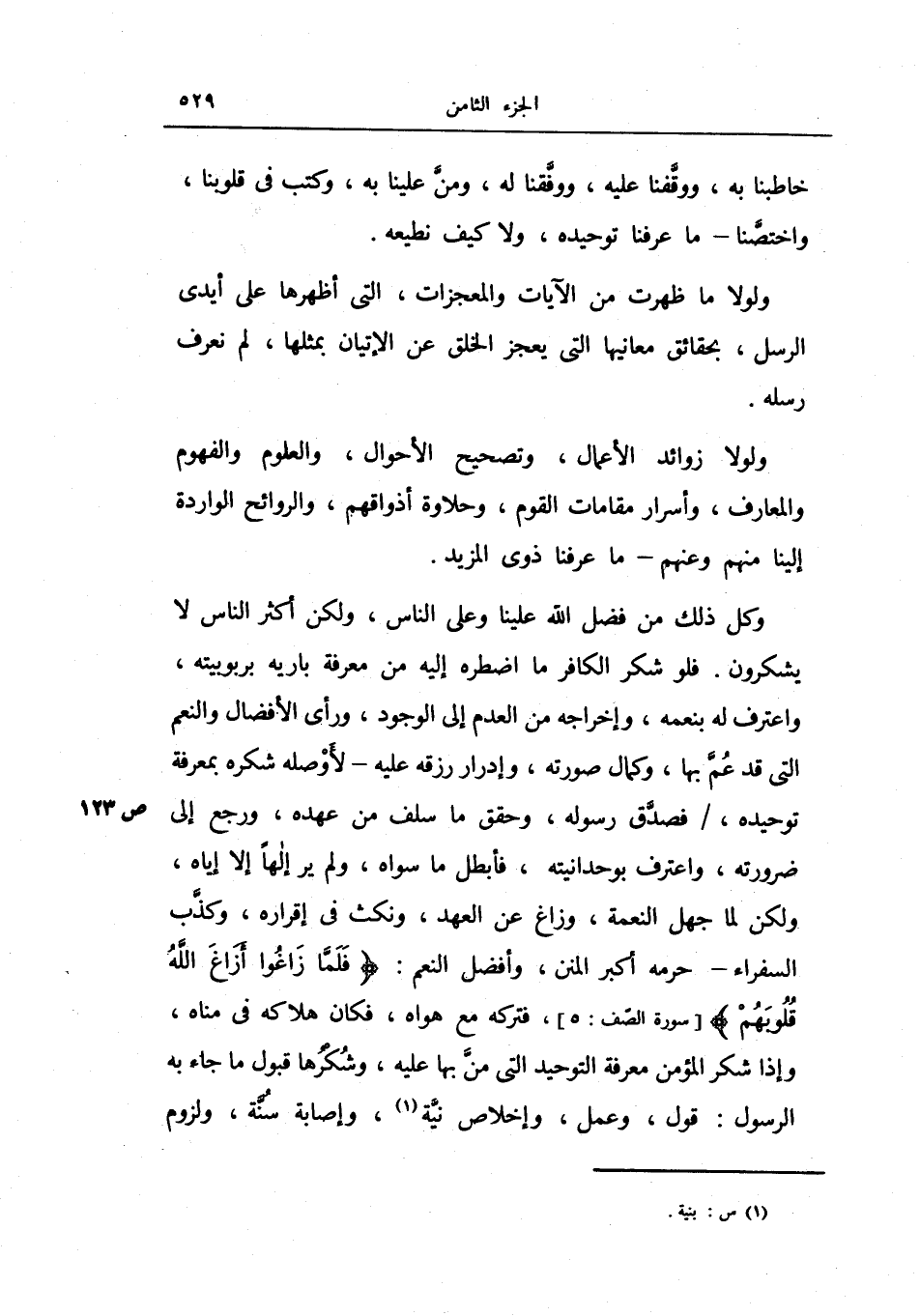 وزاغ عن العهد، ونكث في إقراره، وكذب السفراء - حرمه أكبر المنن، وأفضل النعم: {فلما زاغوا أزاغ الله قلوبهم} ، فتركه مع هواه، فكان هلاكه في مناه، وإذا شكر المؤمن معرفة التوحيد التي من بها عليه، وشكرها قبول ماجاء به الرسول: قول، وعمل، وإخلاص نية، وإصابة سنة، ولزوم