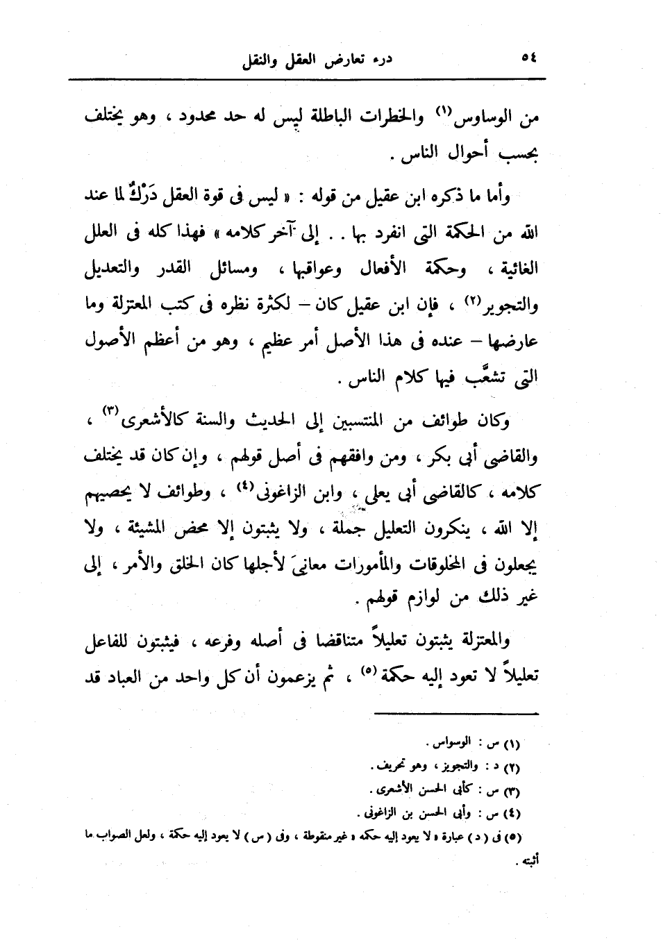 وكان طوائف من المنتسبين إلى الحديث والسنة كالأشعري، والقاضي أبي بكر، ومن وافقهم في أصل قولهم، وإن كان يختلف كلامه، كالقاضي أبي يعلى، وابن الزاغوني، وطوائف لا يحصيهم إلا الله، ينكرون التعليل جملة، ولا يثبتون إلا محض المشيئة، ولا يجعلون في المخلوقات والمأمورات معاني لأجلها كان الخلق والأمر، إلى غير ذلك من لوازم قولهم.
