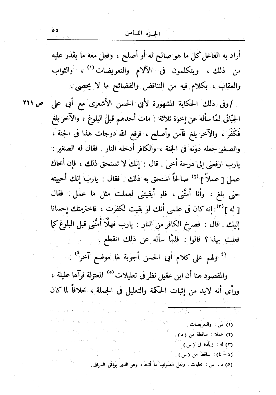 وفي ذلك الحكاية المشهورة لأبي الحسن الأشعري مع أبي علي الجبائي لما سأله عن إخوة ثلاثة: مات أحدهم قبل البلوغ، والآخر بلغ فكفر، والآخر بلغ فآمن وأصلح، فرفع الله درجات هذا في الجنة، والصغير جعله دونه في الجنة، والكافر أدخله النار.